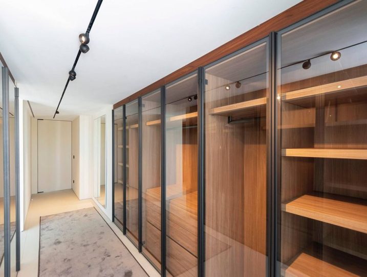 On the main floor, a spacious 90 sqm area with spectacular windows houses a bright living-dining room and a central kitchen with an island, fully equipped with designer furniture and state-of-the-art appliances. The kitchen furniture and countertop color can be customized to the client’s taste, offering the possibility to adapt the space to their own style.