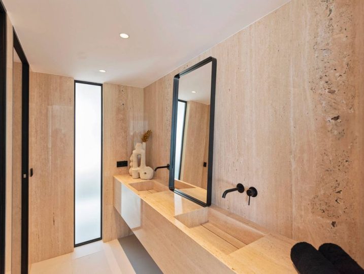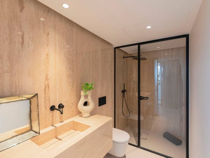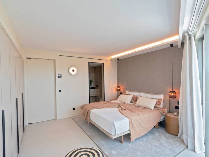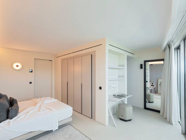 It features 3 large en-suite bedrooms, all with private bathrooms and high-quality finishes. The bathroom details, such as mirrors, cabinets, and coverings, can be modified according to preference, creating a unique and personalized environment. The master bedroom, 22 sqm in size, includes a separate 14 sqm dressing room and direct access to the terrace with views of the sea and Dalt Vila.