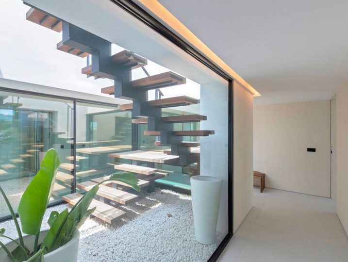 An impressive terrace surrounds the entire property, offering panoramic views of the Mediterranean and the old town of Ibiza. On the upper floor, the sensational 250 sqm solarium features an infinity pool, a chill-out area, and relaxation areas, ideal for enjoying the sunset and the Ibiza climate all year round.