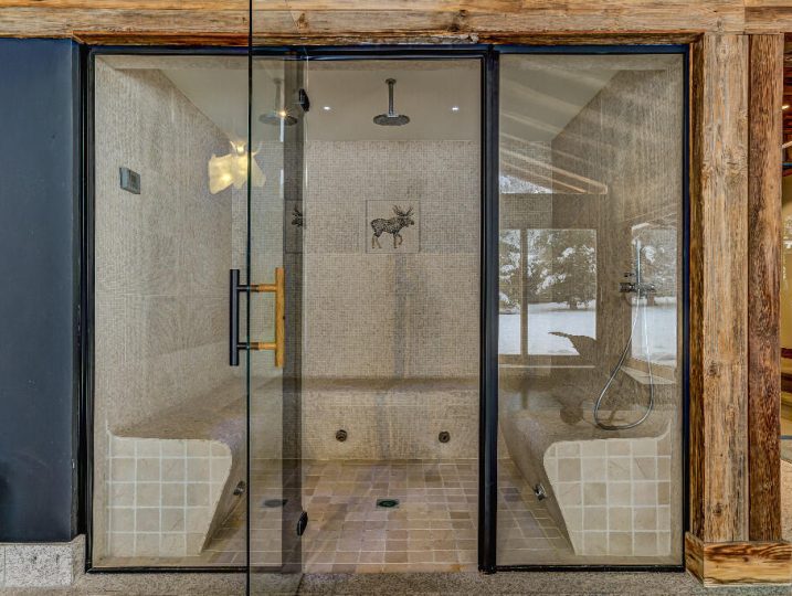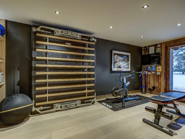 Ground floor: A spacious 45 m2 master suite with direct access to the garden and a mezzanine dressing room. A large entrance hall with a majestic staircase, two 24 m2 bedrooms with own private bathrooms and direct access to the garden and another separate bathroom. An office and a wellness area including a Technogym equipped gym, a hammam and a 5 x 3 meter indoor swimming pool with a counter-current swimming system. This level also includes a laundry room and a winter entrance with ski / bike area.