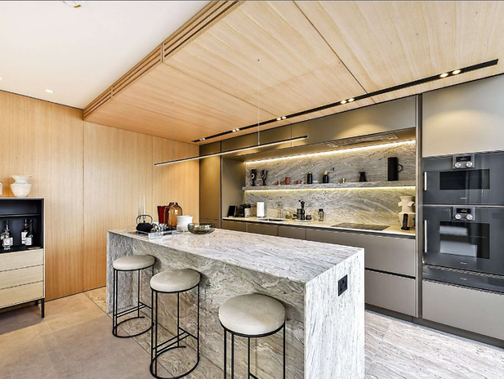 The penthouse is comprised of lateral flowing spaces filled with natural light. It is crafted from exceptional materials with an obsessive devotion to detail. The results feature balance and lightness in sky-filled rooms, surrounded by panoramic views of the London skyline.