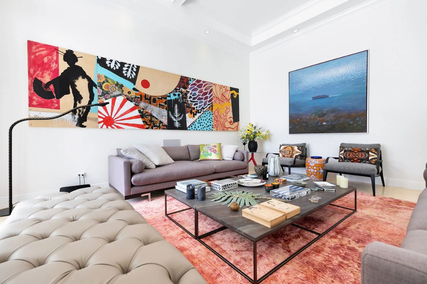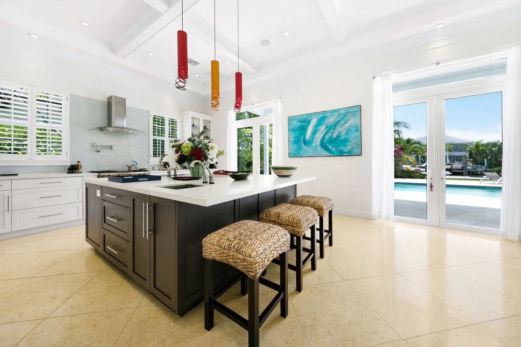 The open-plan living area is centered around a custom kitchen with quartz countertops and premium appliances, flowing naturally into the dining and lounge spaces. Four sets of French doors open directly onto the covered veranda, allowing guests to enjoy effortless transitions between indoor comfort and outdoor relaxation.