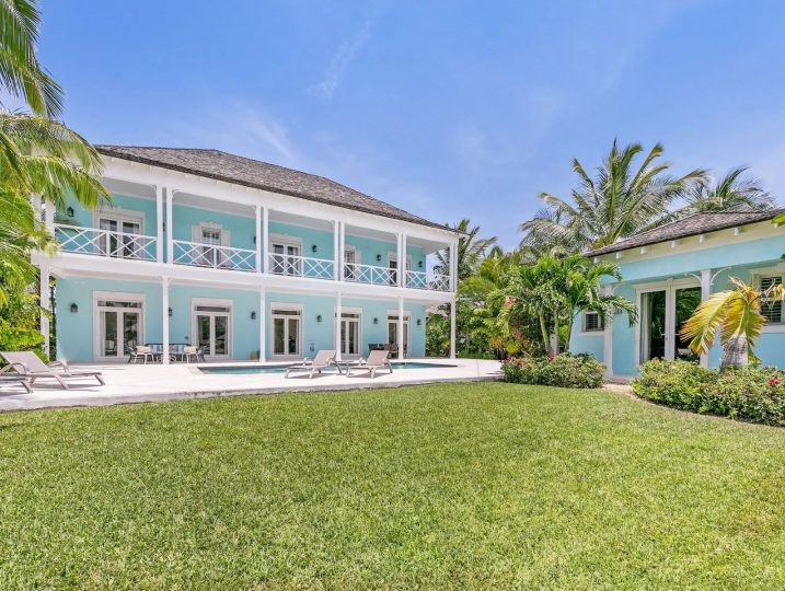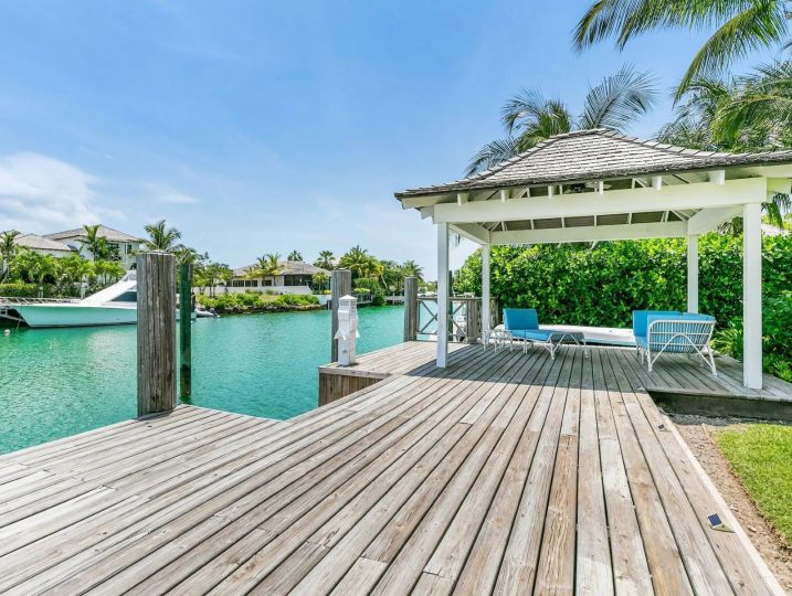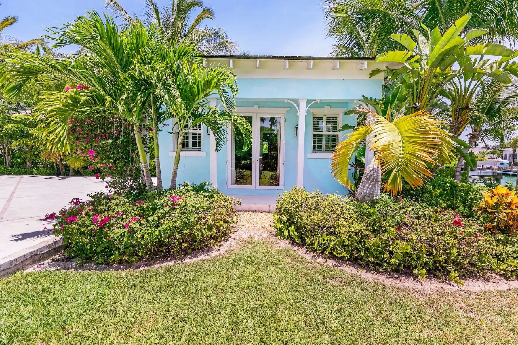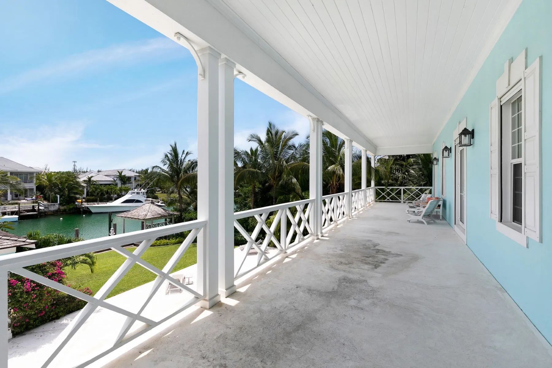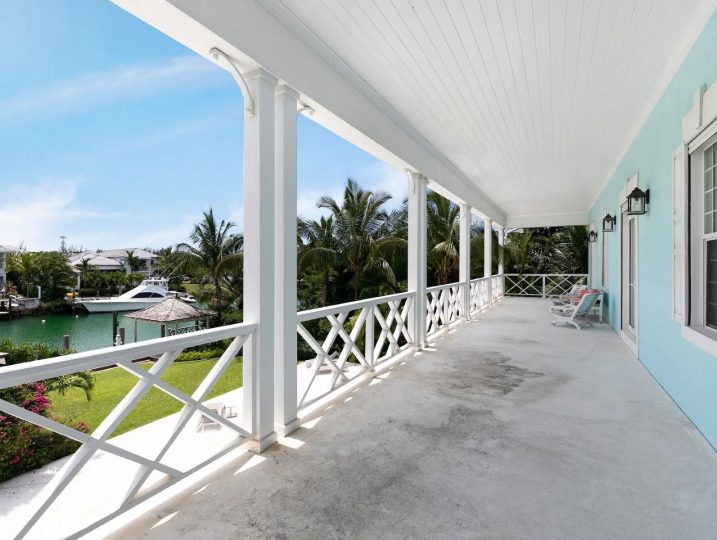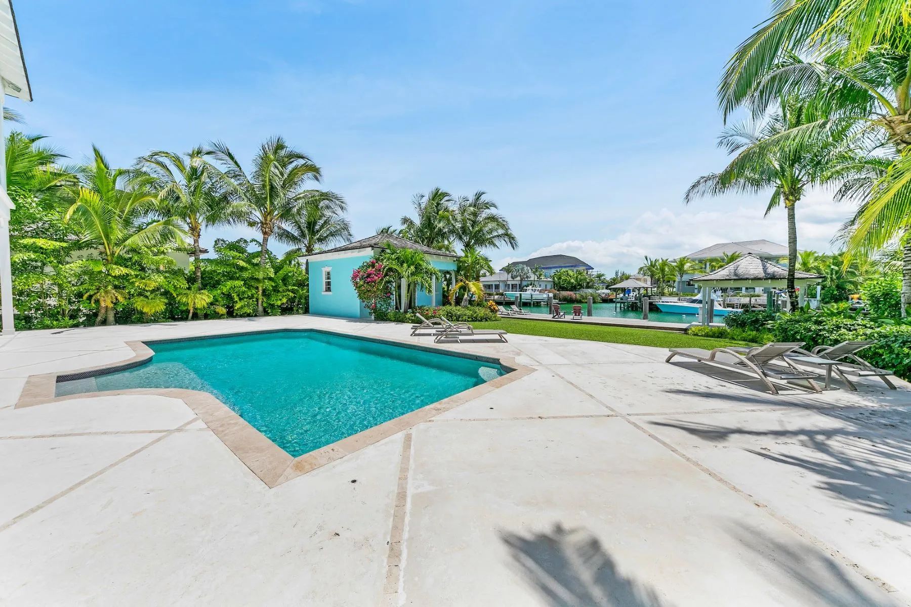 The expansive veranda leads to a landscaped pool terrace and garden, extending toward the canal-side dock equipped with water, electricity, and shaded seating—perfect for boating, sunset cocktails, or simply enjoying the tranquil surroundings. Designed for comfort, privacy, and effortless entertaining, Two Palms offers a refined yet welcoming setting for an unforgettable stay in The Bahamas.
