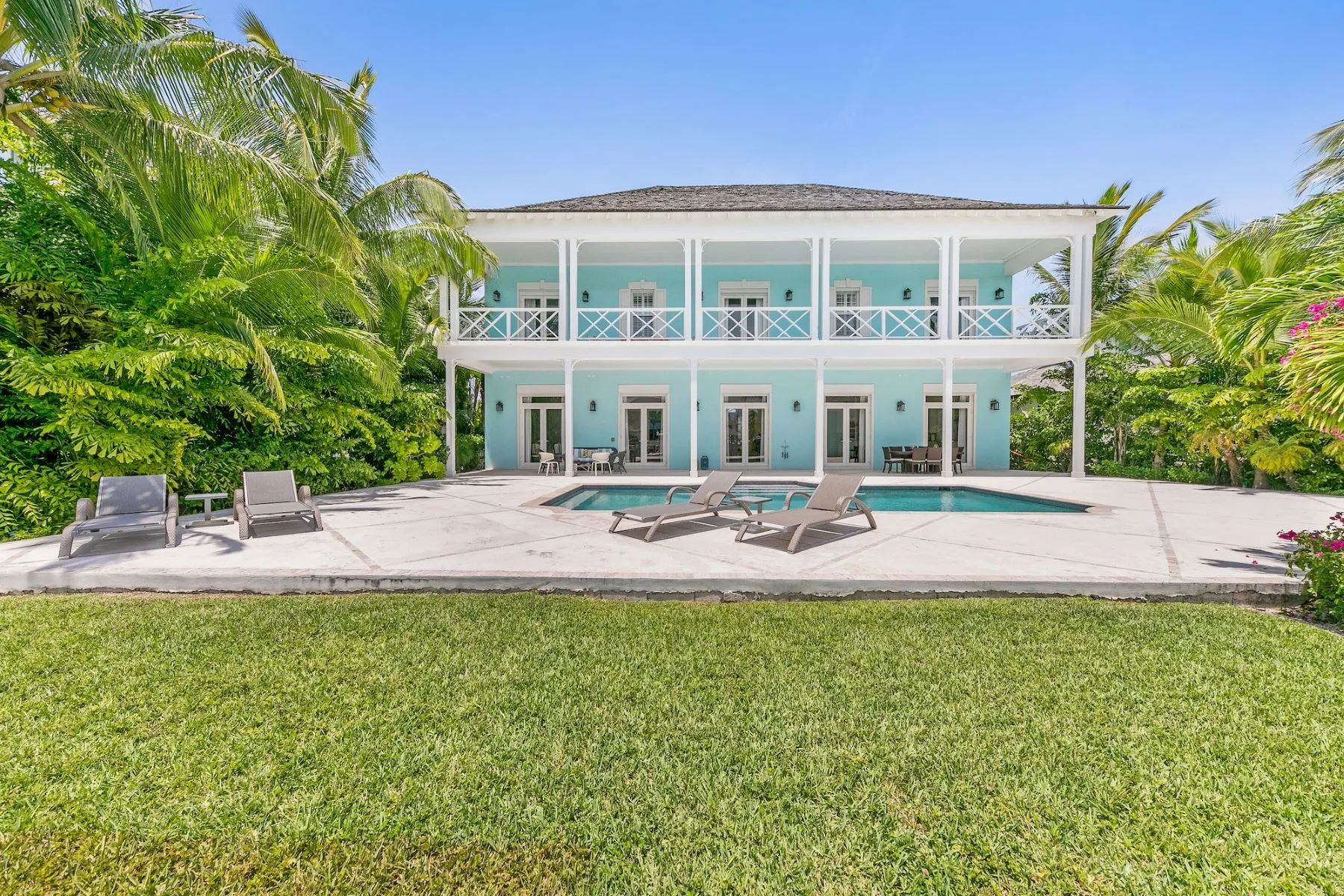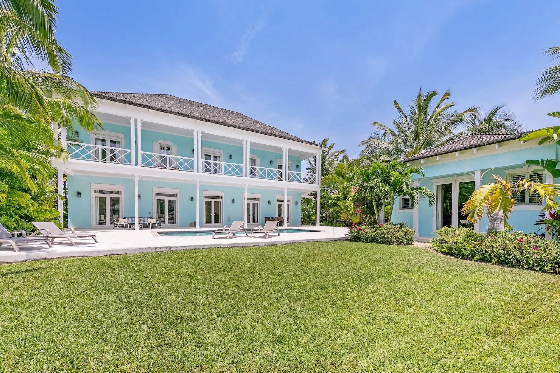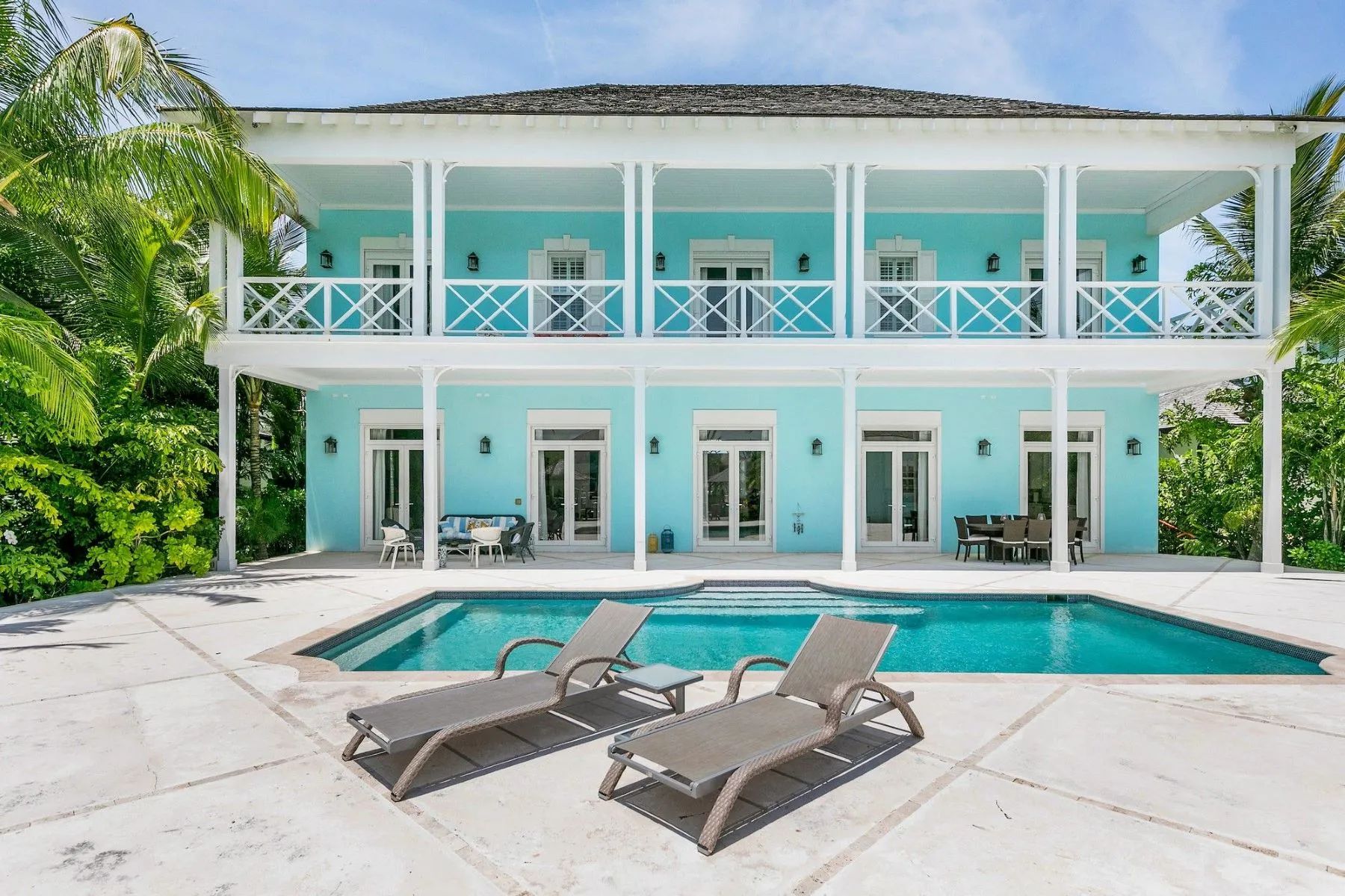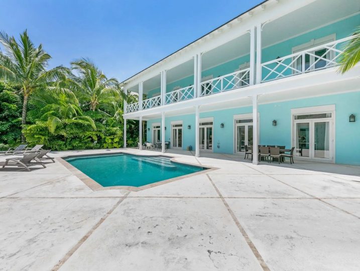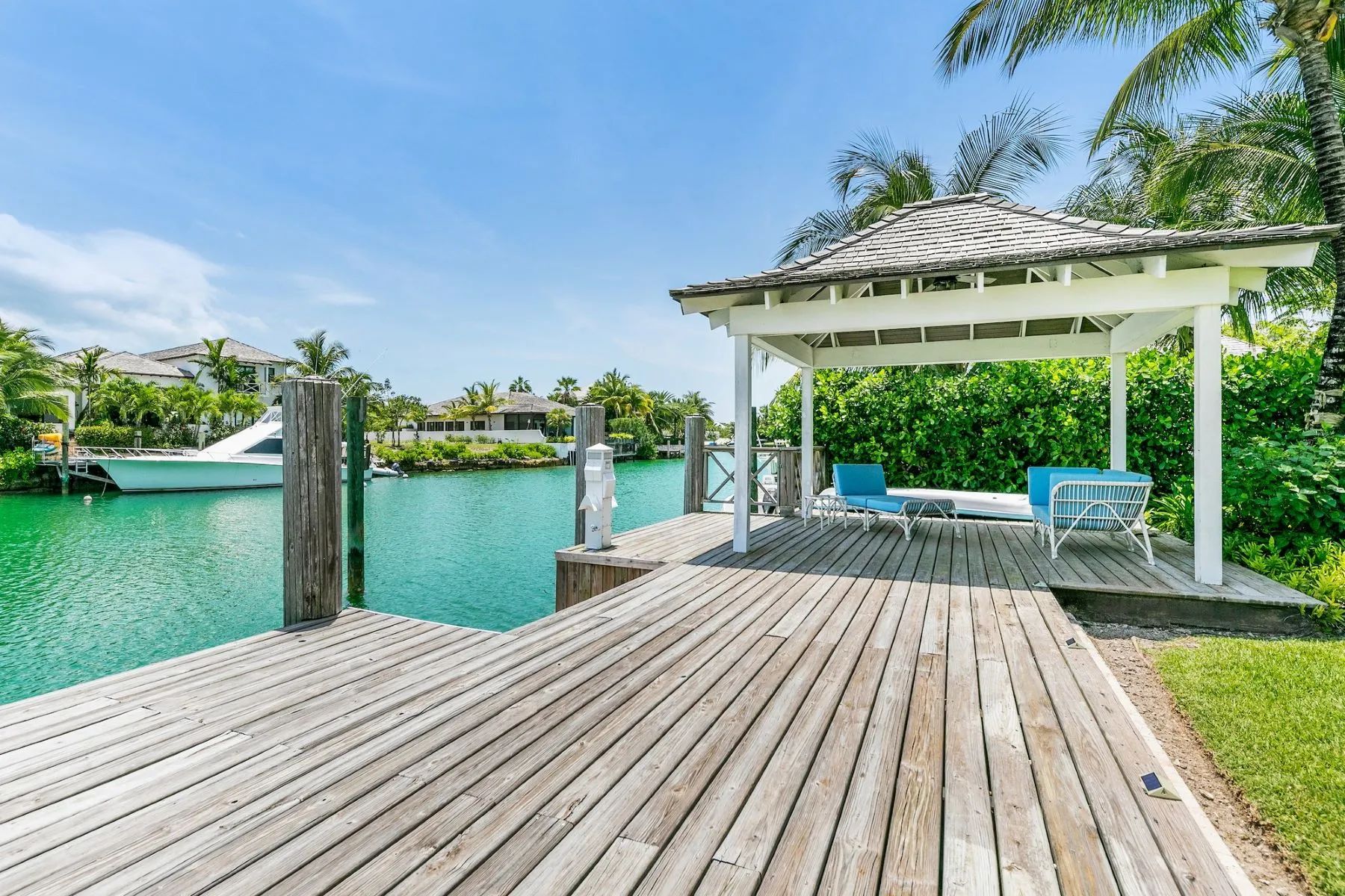 The expansive veranda leads to a landscaped pool terrace and garden, extending toward the canal-side dock equipped with water, electricity, and shaded seating—perfect for boating, sunset cocktails, or simply enjoying the tranquil surroundings. Designed for comfort, privacy, and effortless entertaining, Two Palms offers a refined yet welcoming setting for an unforgettable stay in The Bahamas.