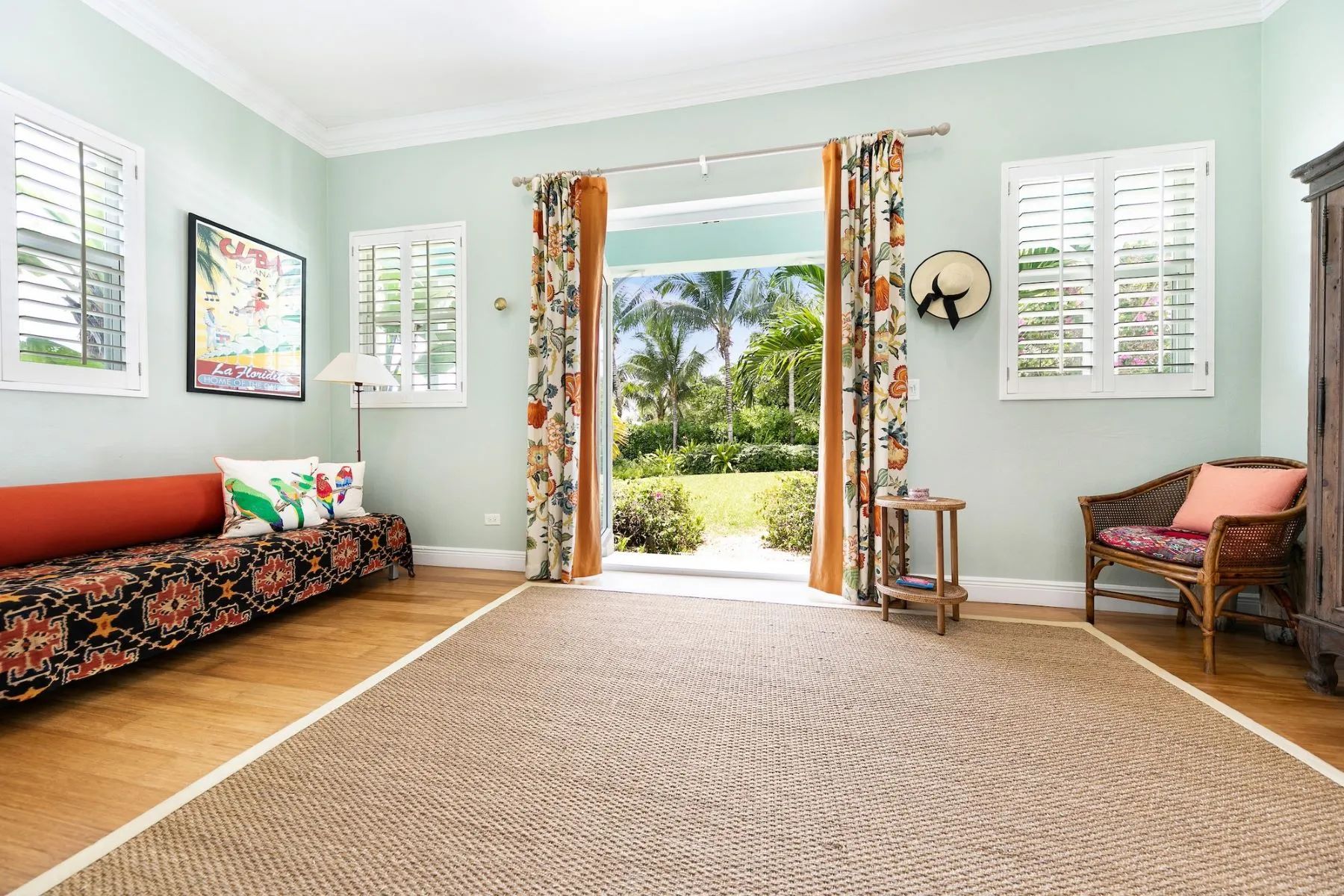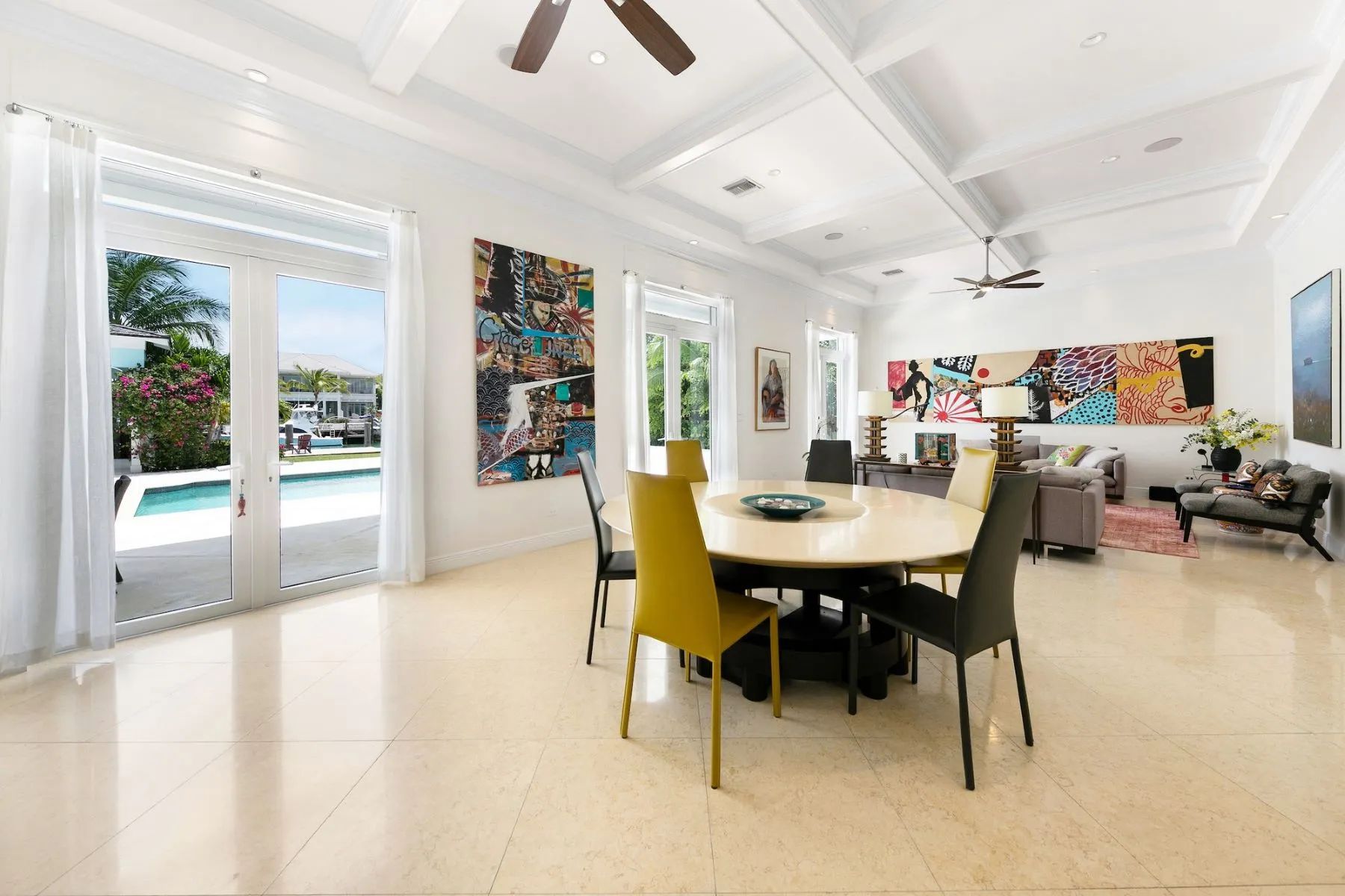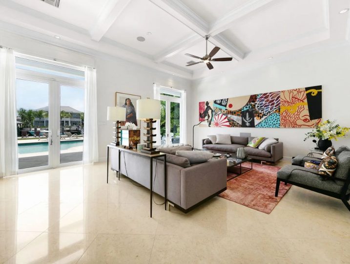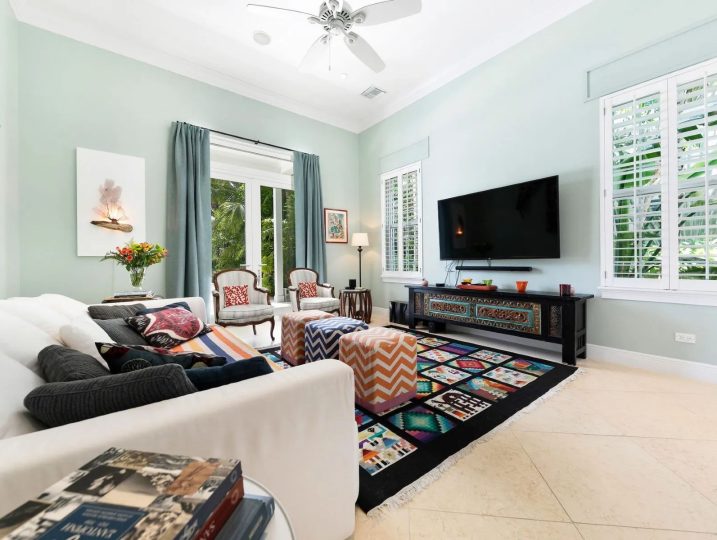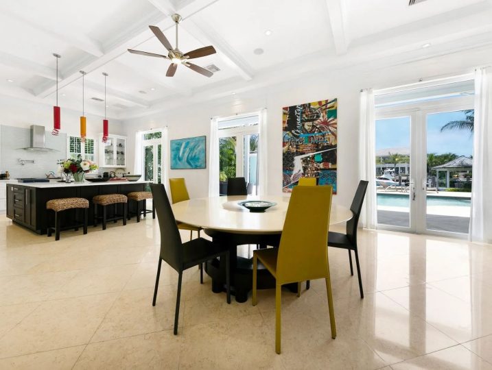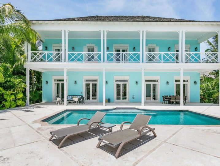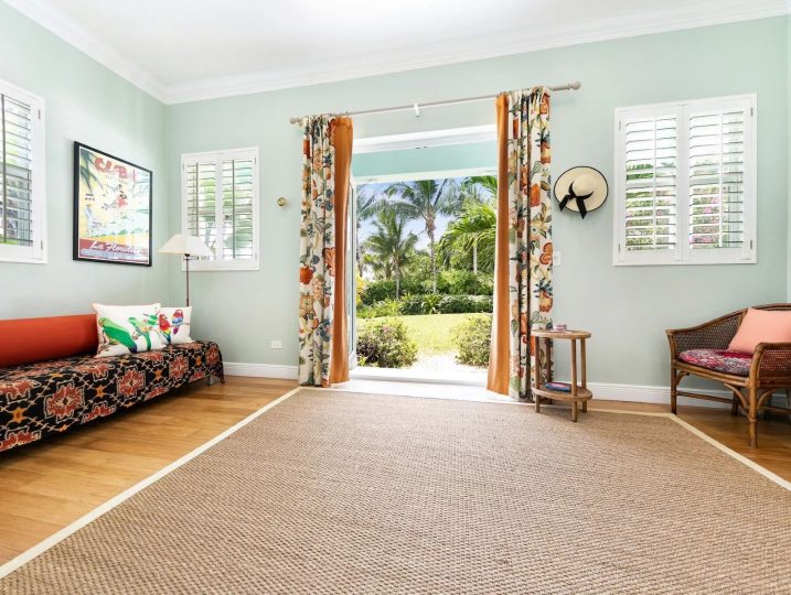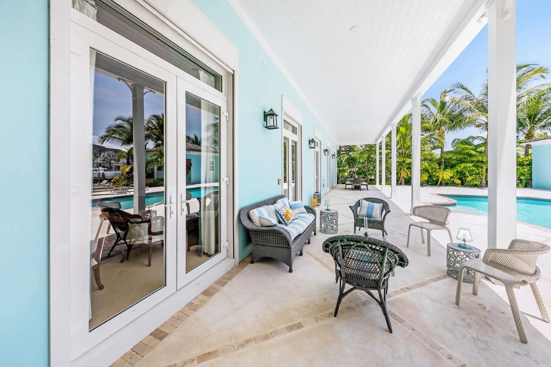 The expansive veranda leads to a landscaped pool terrace and garden, extending toward the canal-side dock equipped with water, electricity, and shaded seating—perfect for boating, sunset cocktails, or simply enjoying the tranquil surroundings. Designed for comfort, privacy, and effortless entertaining, Two Palms offers a refined yet welcoming setting for an unforgettable stay in The Bahamas.